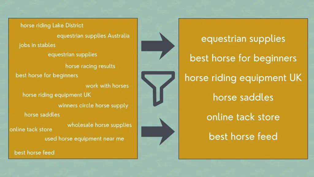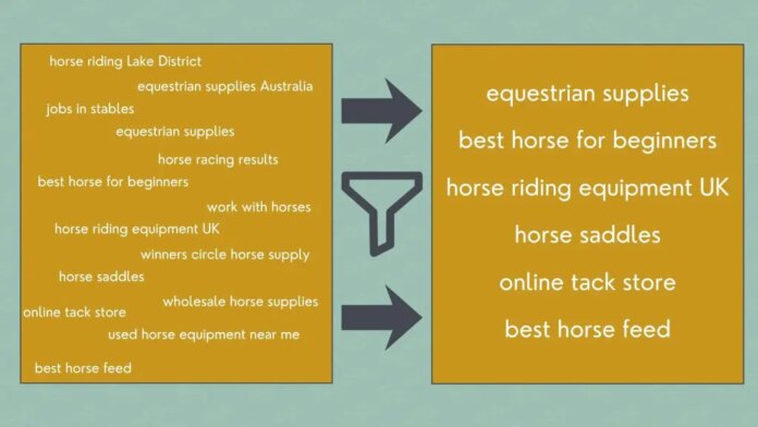 Gráfico que muestra el filtrado de palabras clave para IA para estrategias de investigación de temas y palabras clave