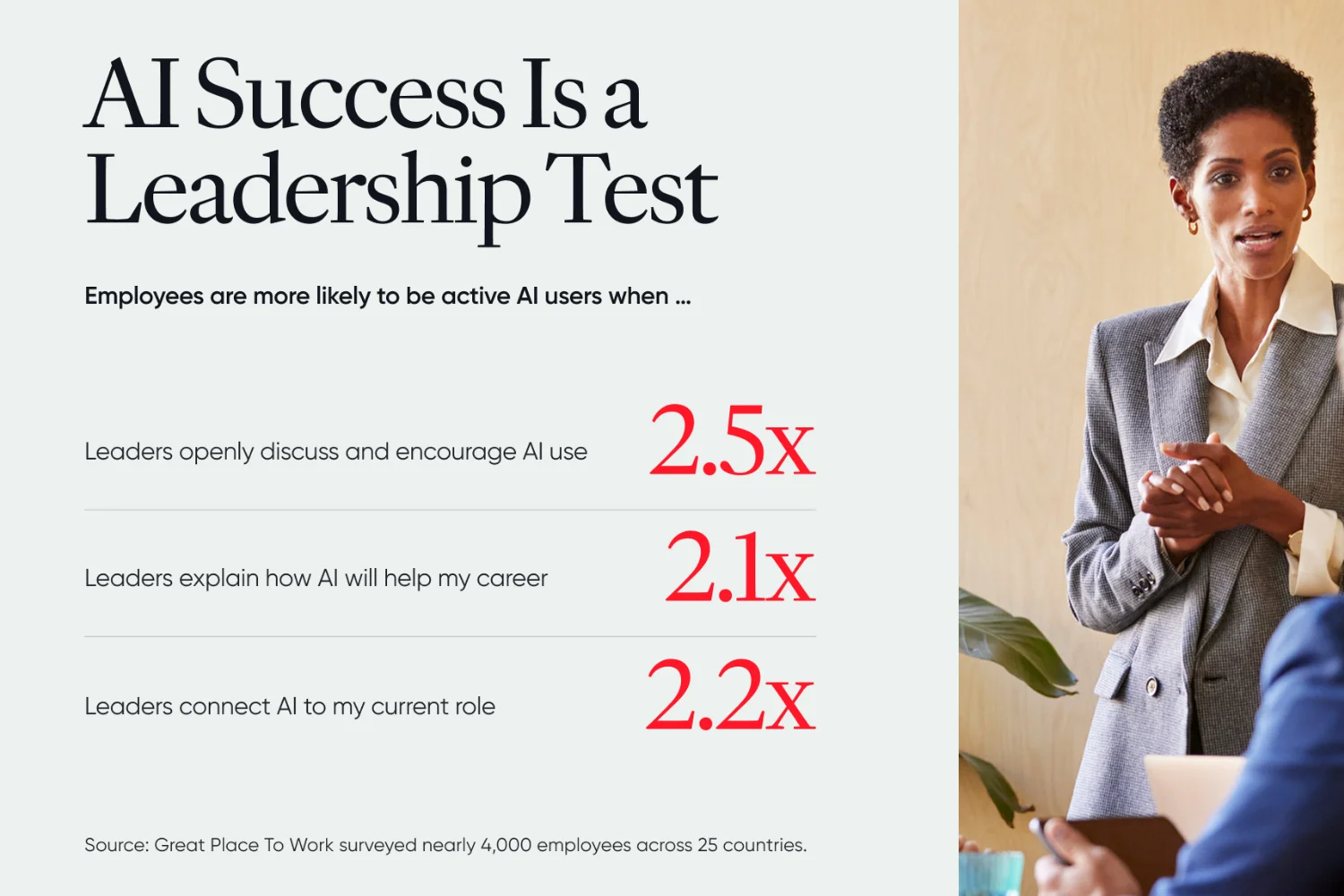 ✅ 验证点: 根据 Great Place To Work 对 25 个国家近 10,000 名员工进行的全球劳动力研究,感到心理安全的员工更有可能接受人工智能——这证实了信任,而不是培训,是采用人工智能的主要推动力。